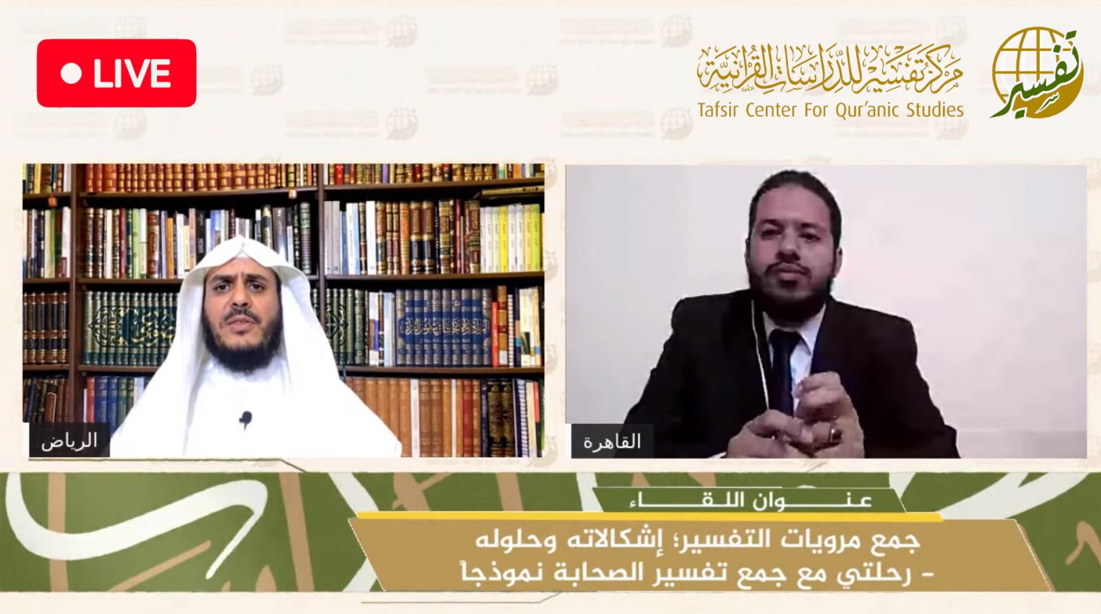 متابعةً للقاءات التي يعقدها مركز تفسير للدراسات القرآنية؛ أقام المركز مساء الثلاثاء الموافق ٣٠ ربيع الآخر ١٤٤٢هـ اللقاء الـ65 من لقاءاته الشهرية لأهل التفسير بعنوان: "جمع مرويات التفسير (إشكالاته وحلوله)؛ رحلتي مع جمع تفسير الصحابة نموذجًا" مع فضيلة الدكتور/ عبد الرحمن عبد العال المشدّ، وذلك عبر البث المباشر على قناة اليوتيوب الخاصة بمركز تفسير، وعدد من منصات التواصل الاجتماعي.