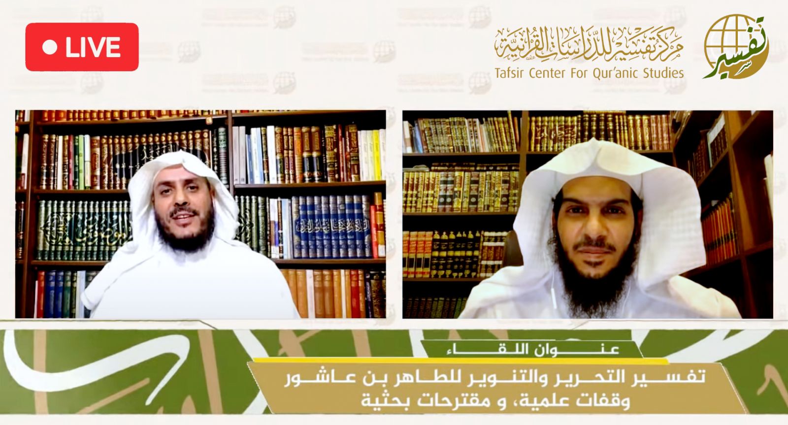 أقام مركز تفسير للدراسات القرآنية مساء الثلاثاء الموافق 24 ربيع الأول 1442هـ اللقاء الـ64 من لقاءاته الشهرية لأهل التفسير بعنوان: "تفسير التحرير والتنوير للطاهر بن عاشور؛ وقفات علمية ومقترحات بحثية" مع فضيلة الدكتور/ محسن بن حامد المطيري، وذلك عبر البث المباشر على قناة اليوتيوب الخاصة بمركز تفسير، وعدد من منصات التواصل الاجتماعي.