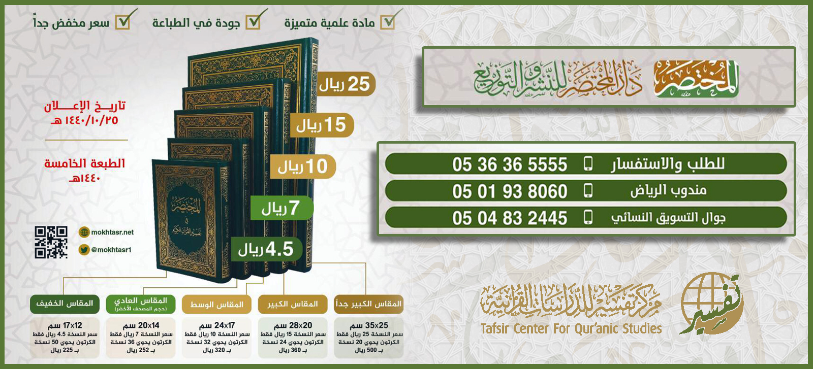 صدرت الطبعة الخامسة من كتاب: المختصر في تفسير القرآن الكريم، والذي روعي فيه وضوح العبارة وسهولتها، مع العناية بذكر مقاصد السور وفوائد الآيات، مع عرض ذلك على حاشية صفحات المصحف الشريف، وقد قام بإعداده نخبة من الأكاديميين المتخصصين في الدراسات القرآنية بمحتوى علمي موثوق ومنهجية متميزة، تحت إشراف مركز تفسير للدراسات القرآنية.