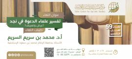 لقاء أهل التفسير (59) "تفسير علماء الدعوة في نجد"، تناول فيه د. السريع الحديث بالكلام عن مدرسة علماء دعوة نجد، فبدأ بالتعريف بها، وأبرز ما اشتُهِرت به، وأشار إلى مشاركتها النافعة في كثير من العلوم، ومنها التفسير والذي كان حاضرًا في مؤلفات كثيرٍ من علمائها، ثُمَّ فصَّل الحديث عن أهم سمات تفسير علماء الدعوة في نجد، وختم اللقاء بعرض مجموعة من النصوص التفسيرية المنتقاة من تفسير علماء الدعوة.