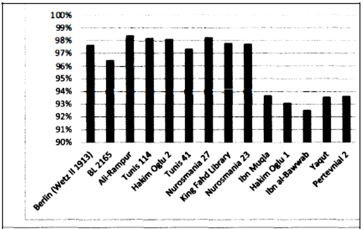 الشكل 3: نسبة تطابق كلمات سورة الإسراء في المصاحف المخطوطة المستخدمة في دراسة الأعظمي مقارنة بمصحف المدينة المنورة المطبوع. المصدر: «النصّ القرآني الخالد عبر العصور»، ص: 48.