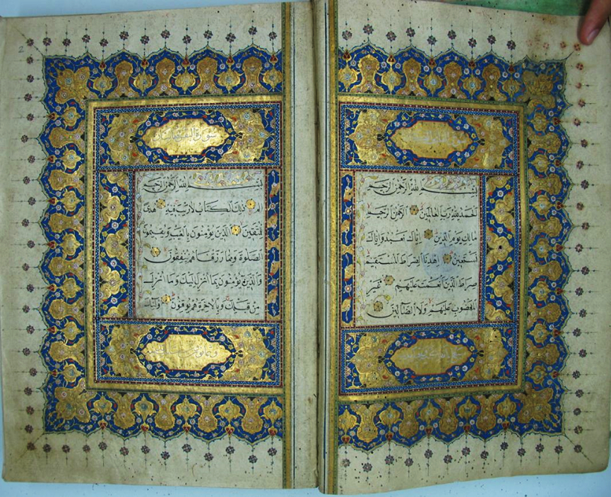 في الورقة الأولى كما في كلّ مصحفٍ، ابتدَأ بسورة الفاتحة وأوائل البقرة، كُتِب بأعلَى الآيات وأسفلها اسمُ السورة وعددُ آياتها بخطِّ ثُلثٍ جليٍّ واضح بلونٍ أبيض على أرضية ذهبيَّة يحيطها إطارٌ مُقَوْلَب، تتشكَّل بعدها أزهار حمراء وبيضاء على أرضية زرقاء مجنَّحة بإطارَين ذهبيَّين، داخل كتيبة مؤطَّرة بالحُمرة والذّهب، وقد زُيِّنت هذه الورقة بزخرفة منتشرة عليها، تتعانق الصَّنعة الهندسيَّة برسم القِباب المُنحنية مع الأشكال النباتيَّة البديعة برَسم الزَّهر داخلها وعلى أطرافها، بحدود خضراء، يُزركِش اللوحةَ اللونُ الأزرقُ والأحمرُ، متداخلًا بالذهبيّ المُضيء.