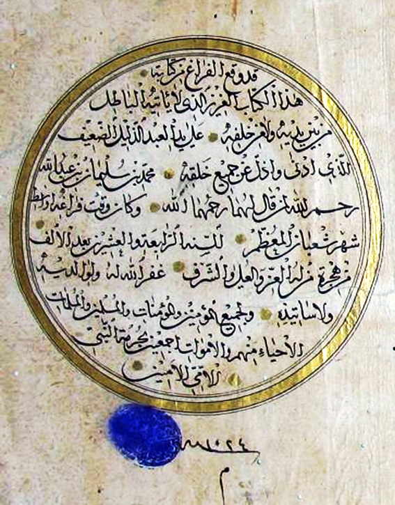 وكانت من حظِّ خطِّ محمد بن سليمان بن عبد الله، وكان تمامُها من يدِهِ ورفعُ القلم عنها أواسط شعبان بعد أربعة وعشرين عامًا من الألفية الثانية للهجرة المصطفوية.
