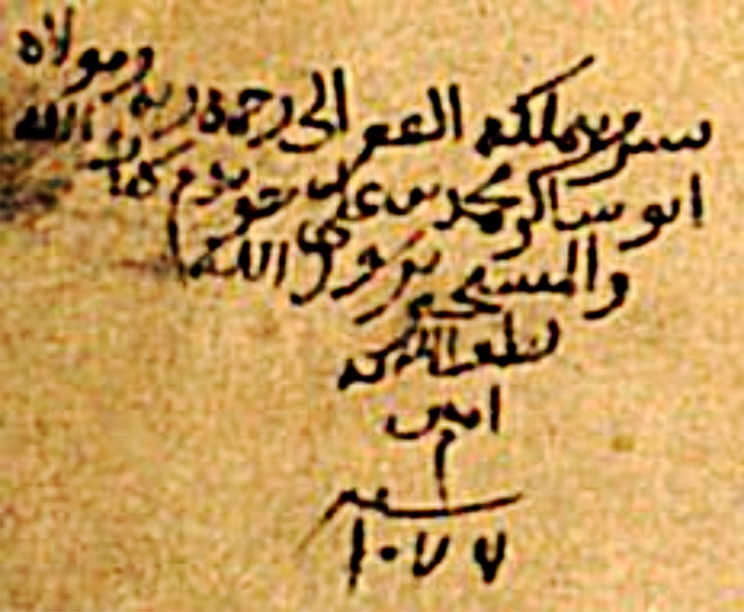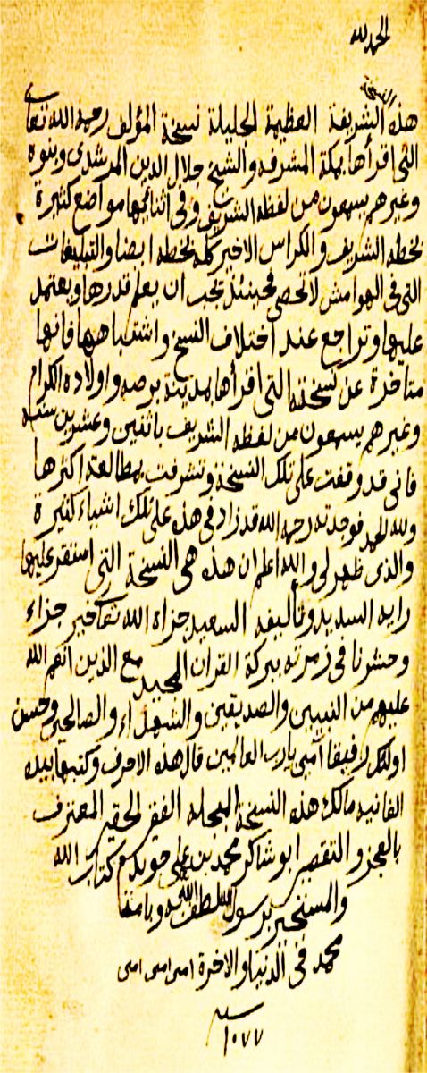 «الحمد لله. هذه النسخة الشريفة العظيمة الجليلة نسخة المؤلف -رحمه الله تعالى- التي أقرأها بمكة المشرَّفة، والشيخ جلال الدين المرشدي وبنوه وغيره يسمعون من لفظه الشريف وفي أثنائها مواضع كثيرة بخطِّه الشريف، والكراس الأخير كلّه بخطه أيضًا والتبليغات التي في الهوامش لا تُحصَى؛ فحينئذ يجب أن يُعلَم قدرها ويُعتمد عليها وتُراجع عند اختلاف النُّسَخ وأشباهها فإنها متأخرة عن نسخته التي أقرأها بمدينة (برصة) -وأولاده الكرام وغيرهم يسمعون من لفظه الشريف- باثنين وعشرين سنة، فإني قد وقفتُ على تلك النسخة وتشرفتُ بمطالعة أكثرها، ولله الحمد، فوجدته -رحمه الله- قد زاد في هذه النسخة على تلك أشياءَ كثيرة، والذي ظهر لي -والله أعلم- أن هذه النسخة التي استقرَّ عليها رأيُه السديد وتأليفُه السعيد، جزاه الله تعالى خير جزاء، وحَشَرَنا في زمرته ببركة القرآن المجيد مع الذين أنعم الله عليهم من النبيين والصدّيقين والشهداء والصالحين وحَسُن أولئك رفيقًا، آمين يا رب العالمين. قال هذه الأحرف وكتَبها بيده الفانية مالك هذه النسخة المبجَّلة الفقير الحقير المعترف بالعجز والتقصير (أبو شاكر محمد بن علي) خُوَيدِم كتاب الله والمستجير برسول الله، لَطَفَ الله به وبأُمّة محمد في الدنيا والآخرة، آمين آمين آمين. سنة 1077».