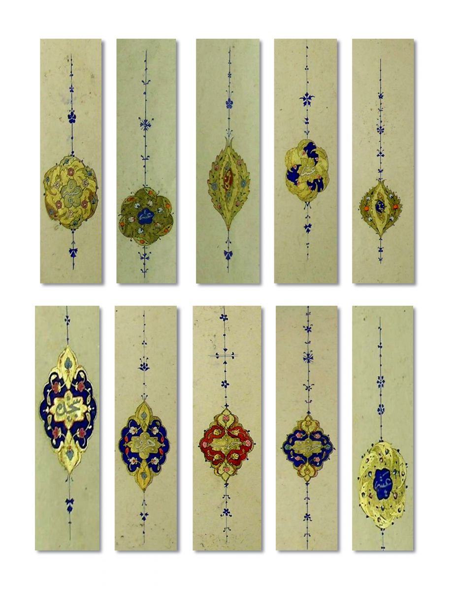 وفي الهوامش أشار إلى الأجزاء، والأحزاب وأنصافها، والعُشور، والخُموس، والسَّجدات داخل قلادات مذيَّلةٍ بديعةٍ، مختلفةِ الصُّور، مزركشةٍ بشكلٍ نباتيٍّ بديعٍ، ملوَّنة بالزُّرقة والذَّهب، مكتوبة بخطِّ ثلثٍ أبيض جليّ.