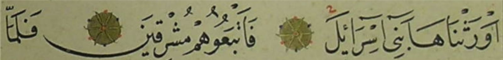 وقد أُطِّرتِ الأوراقُ بإطارٍ ذهبيٍّ ثخين، وكُتبت أسماءُ السّور وعددُ آياتها على رأس كلِّ سورة بكتيبة مزخرفة بزخرفات مختلفة بين كلِّ كتيبةٍ وأخرى ملونة بالذَّهب والزُّرقة ومؤطَّرة بالحُمرة.