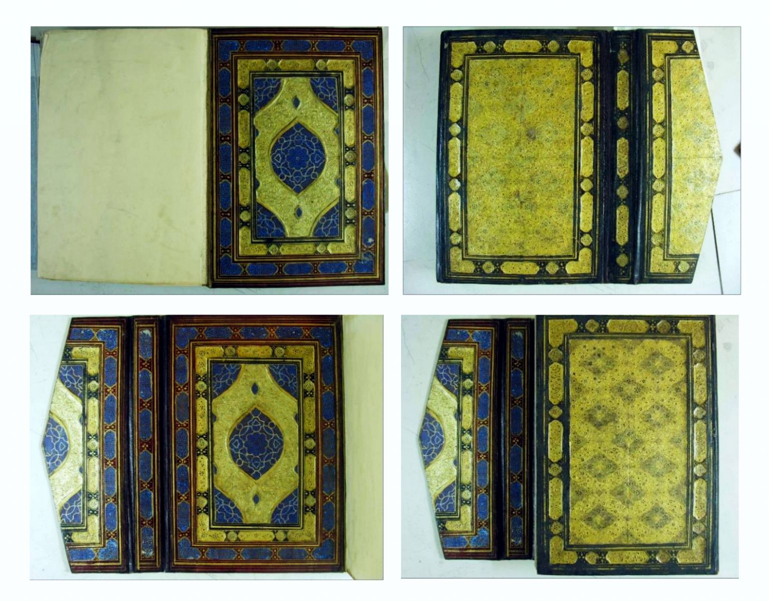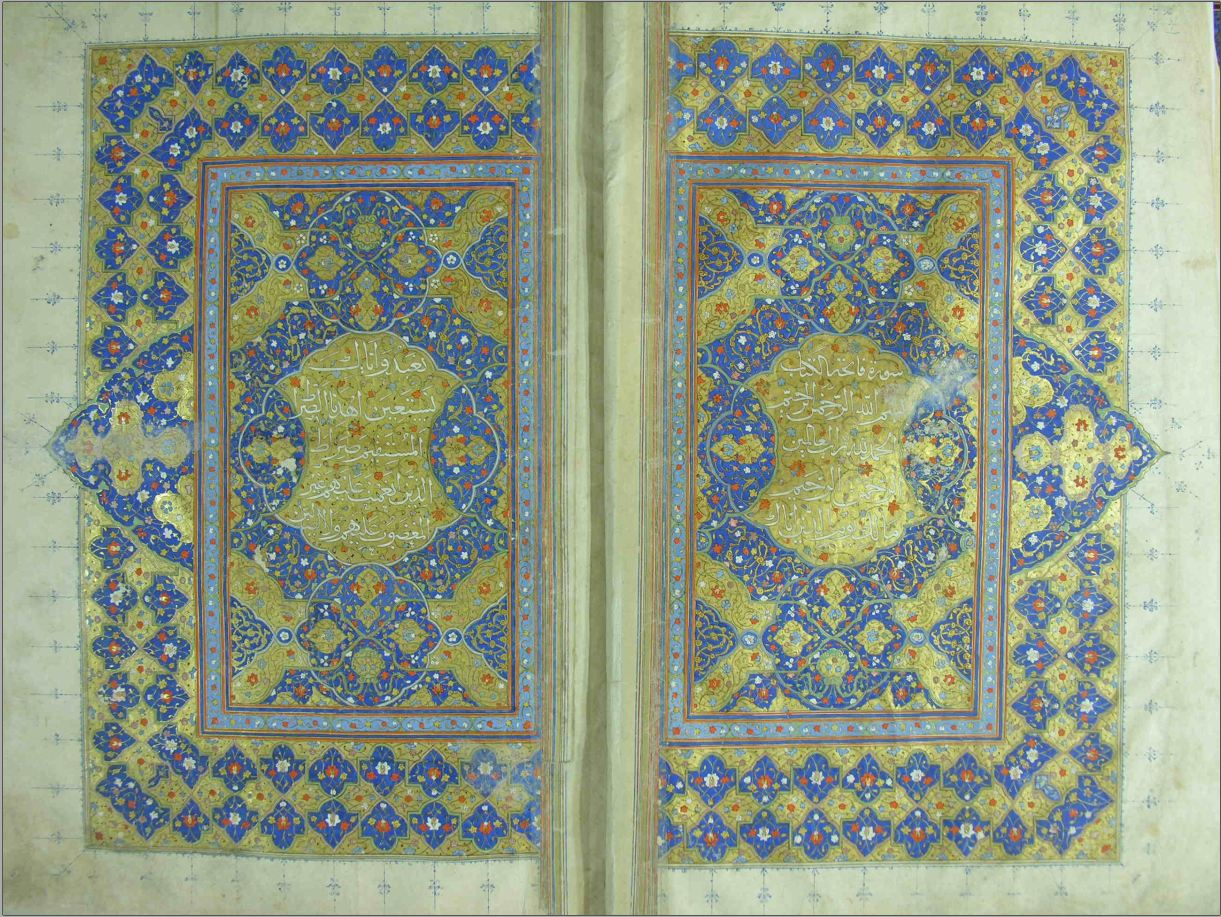 ثُم لوحة استهلاليَّة مزركشة بالشكلِ النباتي عظيمة المَخبَر مهيبة المنظر لا تخرج إلا من يدِ رجُلٍ مِفَنٍّ، كتب على ورقتيها سورة الفاتحة بخطّ ثُلثٍ جليّ بحِبر أبيض مُضِيٍّ، داخل صندوق مطليٍّ بالذهب مُنحَنِي الأضلاع، تحيطه زُرقةٌ وزخرفات ذهبيّة معشَّقة تتمايَز عن بعضها بدوائر وزوايا، يحيط بها إطار محشوّ بالضفائر الزرقاء الفاتحة المنقَّطة بالبياض والحُمرة، يكسوها مربَّعات متقابلة على أشكالِ مصابيح متداخلة بلَوْنَيها الأزرق والمُذهَّب، ثُم تُوِّجَت اللوحة من طرَفَيها بتاجَين عظيمَين في المنتصف وذُيول زرقاء ناعمة، وأرضيَّةُ اللوحة يكسوها الزَّهر وأغصانه الملتوية ملوَّنة بالذهب والبياض والحُمرَة.