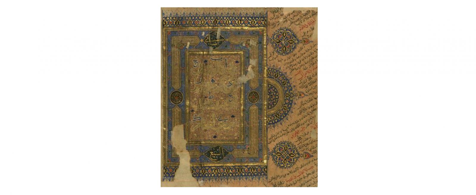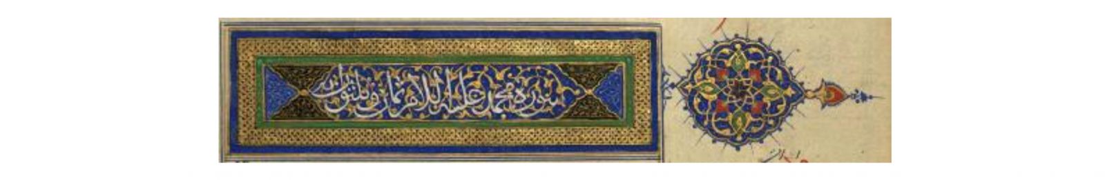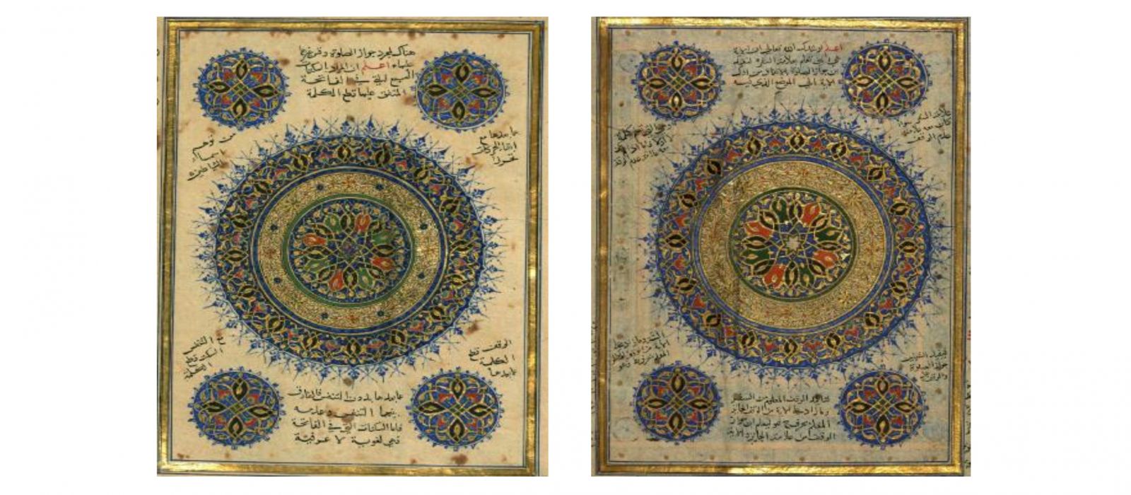 ثم ورقة فيها شمسية كبيرة مزخرفة بالذهب والأشكال النباتية على أرضيات ذهبية وزرقاء بأشكال بديعة وزخرفات مصنوعة مذيَّلة، تحيطها أربع قلائد متداخلة الرسم متعانقة الشكل، ملونة بالزُّرقة والحُمرة والخُضرة والذّهَب مزهَّرة، مؤطَّرة بإطار ذهبي عريض.