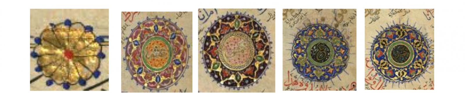 ورُسمت رؤوس الآيات بدوائر مطموسة بالذهب مجنَّحة بأعواد زرقاء دقيقة، يتوسطها نقطة حمراء، ثم قلائد وصناديق متوَّجة مزركشة مذهبة بالشكل النباتي الهندسي الملون بالذّهب والحمرة على خلفية زرقاء، بأشكال مختلِفة بديعة بها الخُموس والعُشور والأجزاء والأحزاب وأنصافها، وأُطِّرَت كلّ الأوراق بإطار مذهَّب وأزرق دقيق.