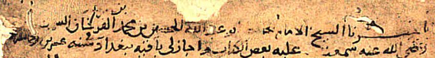 «أخبرنا الشيخ الإمام الحافظ أبو عبد الله الحسين بن محمد بن عليّ الفرخان السمناني -رضي الله عنه- سمعتُ عليه بعض الكتاب وأجاز لي باقيهِ ببغداد سنة عشرين وخمسمائة».