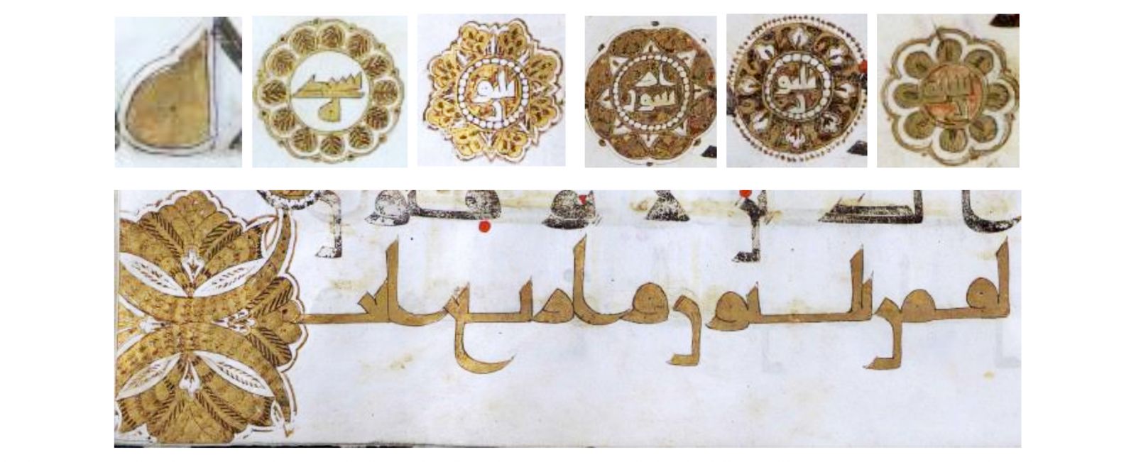 ورُسمت دائرة مطموسة بالذّهب المطفأ، على إطارها ومنتصفها نقاط سوداء في بعض نهايات الآيات دلالةً على رؤوس الآيات، ودائرة مزخرفة بالذّهب مزينة بالأشكال المختلفة وبداخلها مكتوب مسمَّى الأرقام العشرية (عشرون، ثلاثون، أربعون) دلالةً على العُشور، ودائرة ذهبية متوسطة الحجم مميزة الشكل ذات زاوية حادة تقف عند رأس كلّ خمس آيات دلالةً على الخُموس، ثم قلادة مزينة بالذّهب مزركشة بالأشكال النباتية بداخلها مكتوب بالذهب «سجدة» بالخطّ نفسه.