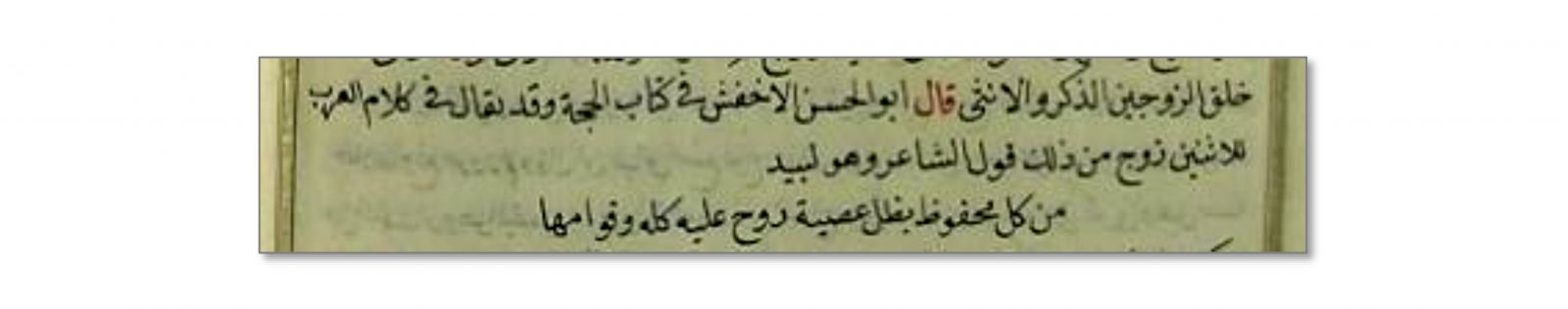 جاء في تفسير ابن عطية في طبعة قطر الثانية وطبعة دار ابن حزم زيادة هاء في لفظة (كتاب) من قول ابن عطية: «قال أبو الحسن الأخفش في كتابه الحجة: وقد يُقال في كلام العرب للاثنين: زوجٌ، ومن ذلك قول لبيد: من كلّ مَحْفُوفٍ يُظِلُّ عِصِيَّه .. زَوجٌ عليه كِلَّةٌ وقِرَامُهَا»[16].