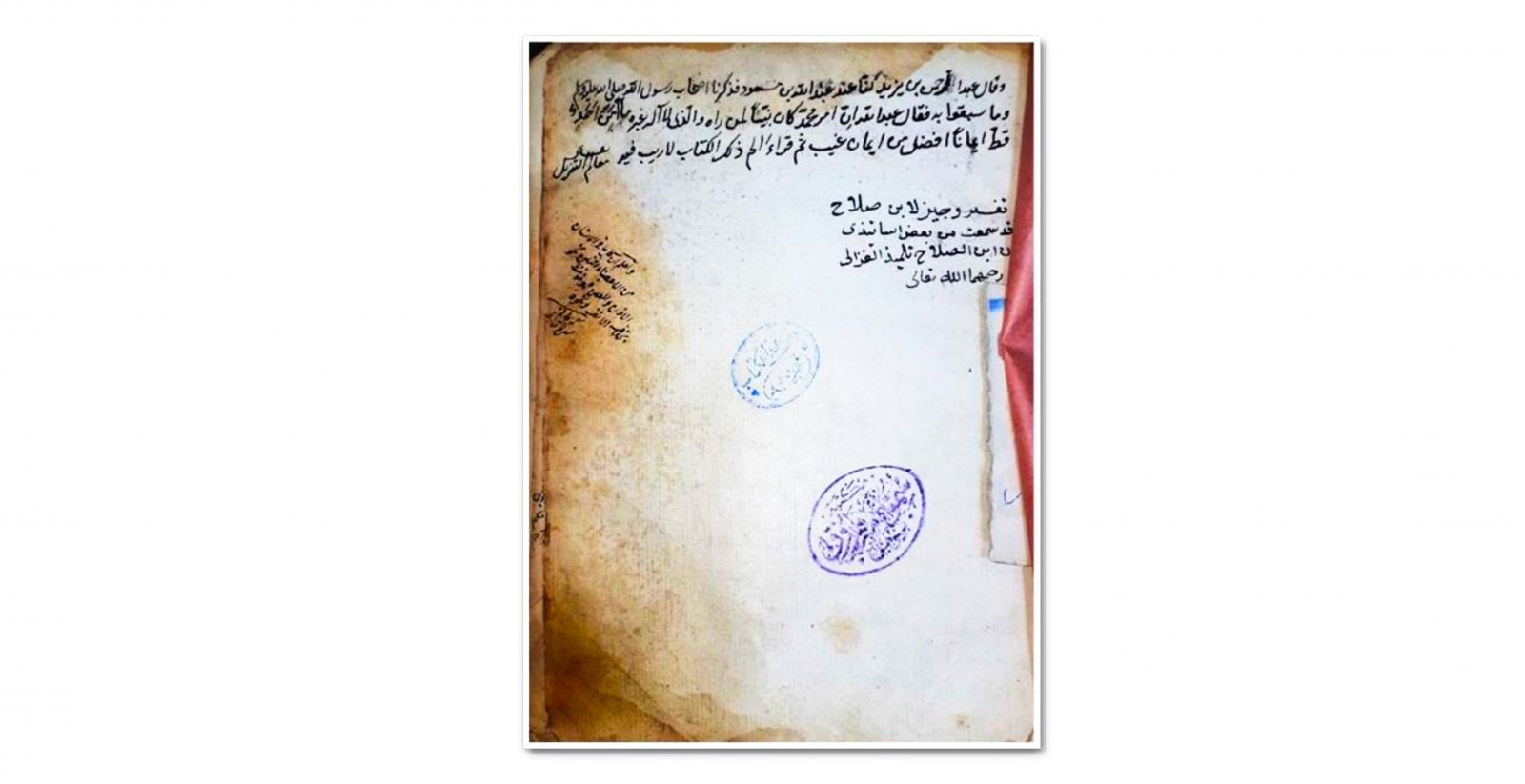 تنبيه: كُتِبَ بعد اسم المخطوط واسم مؤلِّفه عبارة: «قد سمعتُ من بعض أساتذتي أن ابن الصلاح تلميذ الغزالي رحمهما الله تعالى». قلتُ: ومعلوم خطأ هذه العبارة؛ إِذْ وفاة الإمام الغزالي سنة 505هـ أي قبل وفاة ابن الصلاح بـ138 سنة. إلا أن يقصد بذلك أن يكون من تلاميذ تلاميذه فتكون العبارة قِيلت تجوّزًا، أو أن يكون المراد غير ذلك. الخلاصة أنَّ هذه العبارة لا تعنينا بقدر ما يهمّنا أنَّ اسم المخطوط واسم المؤلِّف مكتوبان على أول لوحة من المخطوط.