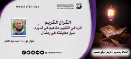 كان للقرآن الكريم عظيمُ الأثر في تغيير النفوس، وقد أمر اللهُ بتدبُّره والعمل به، وهذا الحوار مع د/ أحمد عبد المنعم يدور فيه الحديث حول أثر القرآن في التغيير، وعدد من المفاهيم في تدبُّره، ومعالجة لبعض الإشكالات المتعلقة به، وكيفية معايشته في شهر رمضان.