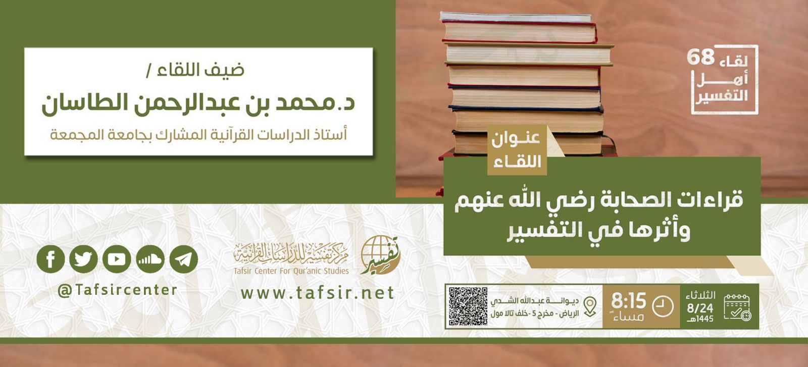 أقام مركز تفسير للدراسات القرآنية مساء الثلاثاء الموافق 28 شعبان 1445هـ الموافق 5/ 3/ 2024م بمدينة الرياض اللقاء الـ68 من لقاءاته الشهرية لأهل التفسير بعنوان: "قراءات الصحابة -رضي الله عنهم- وأثرها في التفسير"، مع فضيلة الدكتور/ محمد بن عبد الرحمن الطاسان، وذلك في ديوانية أ. عبد الله الشدي.